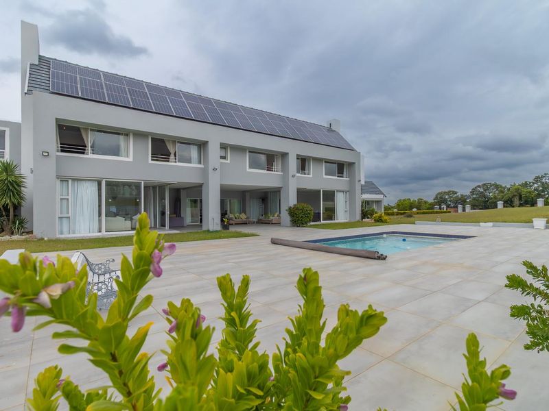 Entertainer’s retreat in serene Saddlebrooke Estate: double‑volume foyer, gourmet SMEG kitchen opening to heated pool, bar/braai patio and sweeping garden. Four bedrooms, four baths, triple garage.