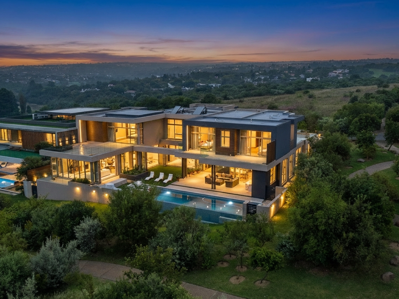 Entertainer's dream in Steyn City's skyline with sweeping lake and river views, alfresco patios and 7m pool. Off-grid solar power and five ensuite bedrooms with double garage.