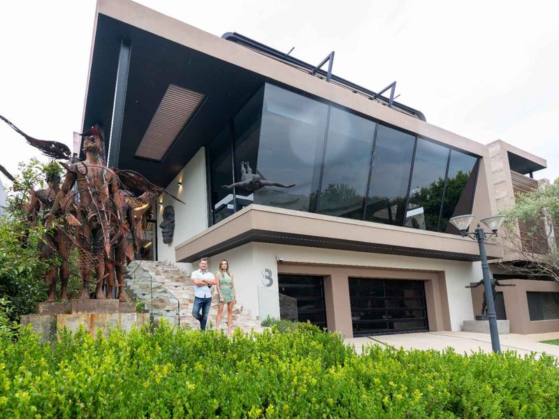 Host sunset soirées on Steyn City's rooftop sky-bar and Jacuzzi, enjoying panoramic estate views, glass elevator, private pool and boma; five ensuite bedrooms and four-car garage.