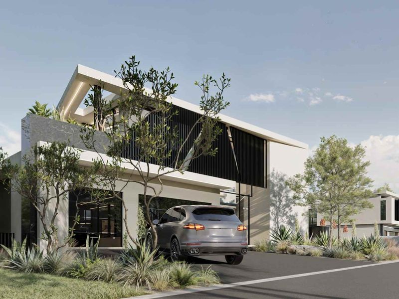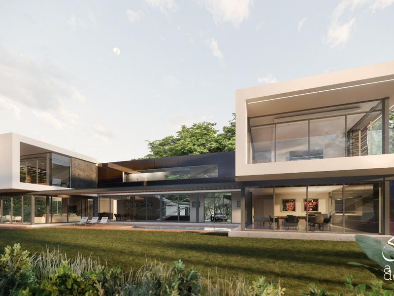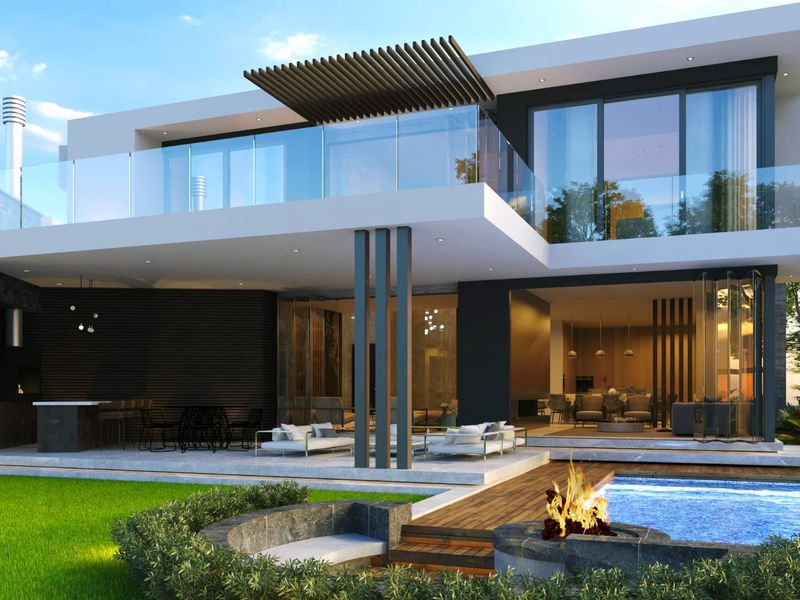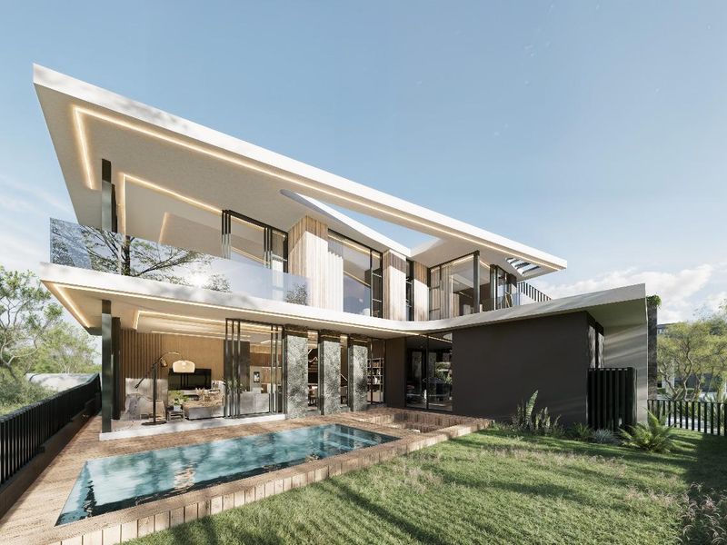 Green-belt modern retreat at The Terraces, Steyn City — sweeping glass facades, private pool and boma for effortless indoor-outdoor entertaining; four en-suite bedrooms and three garages.