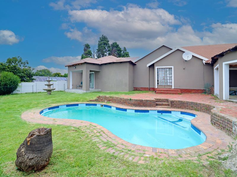 Secure family living in boomed-off Vorna Valley, steps from Mall of Africa and schools — three-bedroom, two-bath home with double garage, heated salt-water pool, jacuzzi and thatch boma.