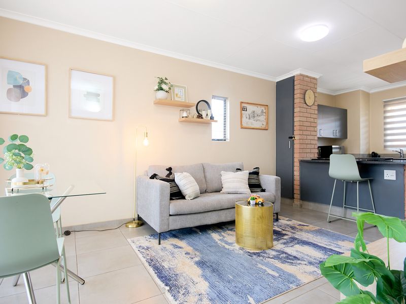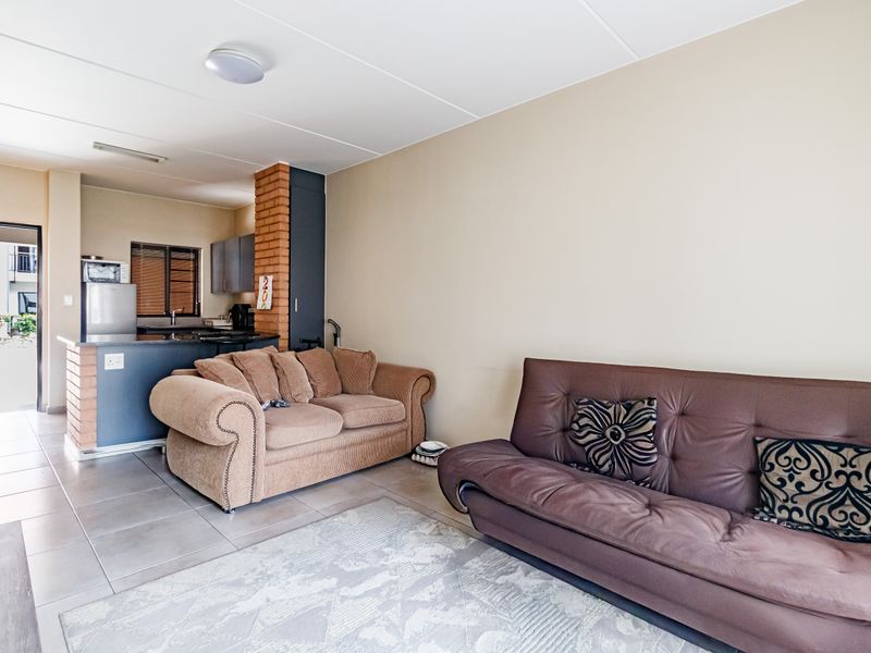 Effortless commuter living with outdoor entertaining — open-plan kitchen and lounge flow to a private garden and patio. Close to Mall of Africa and Gautrain; two bedrooms, one bath, two covered bays.