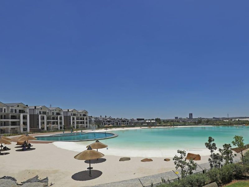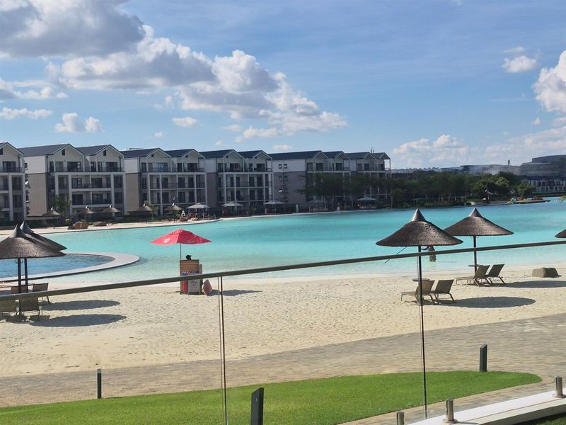 Resort-style living at Munyaka Lifestyle Estate in Waterfall City, with lagoon access and a private balcony with built-in braai — top-floor, two-bed, two-bath, two covered parking.