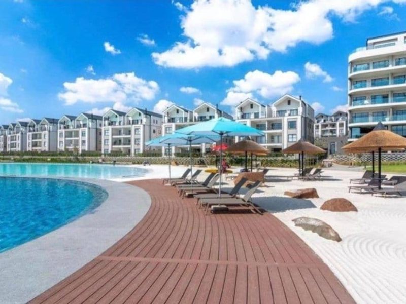 Lagoon-side living in Munyaka, Waterfall — resort amenities, gym and restaurants nearby; modern open-plan apartment with private balcony, integrated kitchen, two bedrooms, two en-suites and two parking bays.