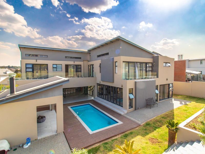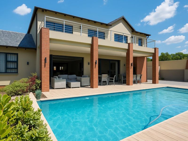 Entertainer's dream with pool and dual braai decks, set in a peaceful, leafy neighbourhood offering expansive garden living; open-plan kitchen, five bedrooms (all ensuites), 5.5 baths, double garage.