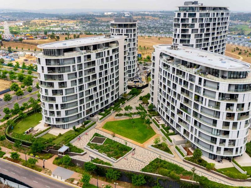 Entertain in elevated urban living with panoramic views from a massive balcony in Ellipse, Kepler Tower — steps from Mall of Africa and Waterfall City; two beds, 2.5 baths, double parking.
