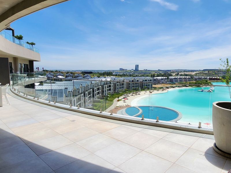 Resort-style living in Munyaka Estate, Waterfall City — penthouse with lagoon and skyline views from a large private balcony, sleek island kitchen, three bedrooms, three bathrooms.