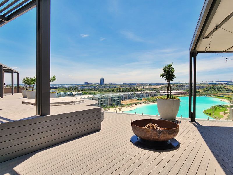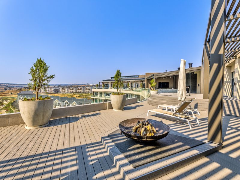 Entertainer's penthouse with panoramic views, walking distance to Mall of Africa and near Waterfall Hospital; rooftop entertainment area with splash pool and built-in braai. Two en-suite bedrooms.