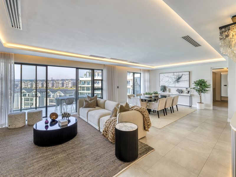 Perched above Blue Lagoon's beach with Waterfall and Sandton skyline views, a signature penthouse boasting a private rooftop jacuzzi, bespoke Stephen Pikus chandeliers, Gaggenau kitchens and butler suite.