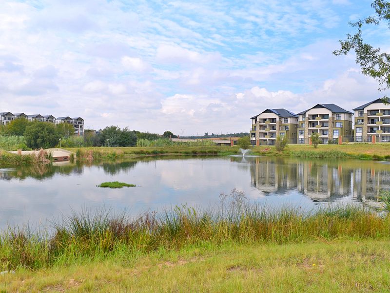 Resort-style living beside the award-winning Lifestyle Centre in Midrand, with north-facing balcony and built-in gas braai, landscaped garden, modern SMEG kitchen, three bedrooms, two bathrooms.