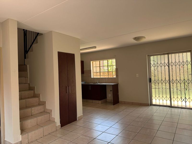 Relaxed, secure living steps from Wonderboom Airport in Deo Favere Complex — corner unit with large private garden, undercover parking, lock-up garage and two bedrooms.