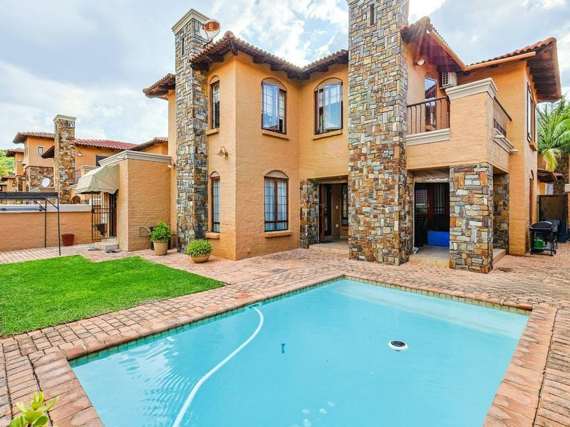 Effortless entertaining and serene living in Stone Manor at Pierneef Koppie, minutes from Lynnwood Bridge and shops, Tuscan-style home with heated swimming pool, three bedrooms and two baths.