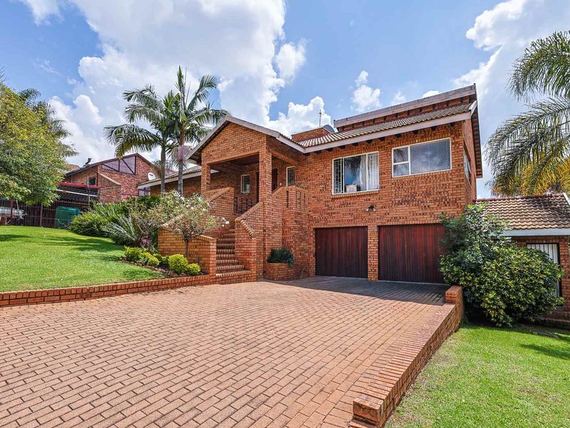 Ridge-top living in Moreleta Park with sweeping suburban vistas and seamless indoor–outdoor flow; entertainer’s level features an eight-seat indoor jacuzzi. Five bedrooms, three bathrooms, double garage.