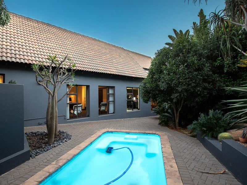 Effortless indoor-outdoor entertaining in upmarket Arathorn Estate, steps from Olympus Village — glazed living area opens to a sparkling pool and manicured garden; four en-suite bedrooms, two garages.