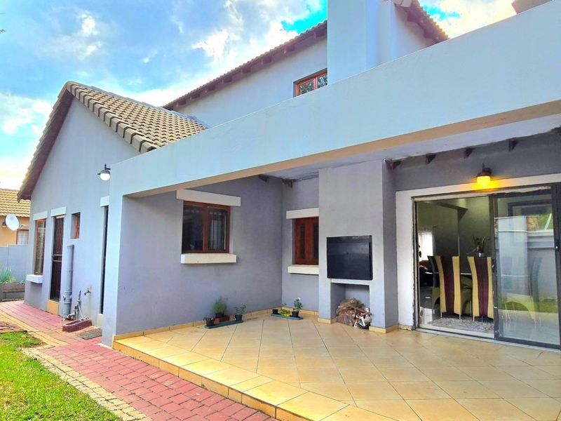 Family-focused living in Boardwalk Manor Estate, Pretoria East, with easy access to shops and schools, private patio with built-in braai, solar backup, three beds, two baths, two covered parking bays.