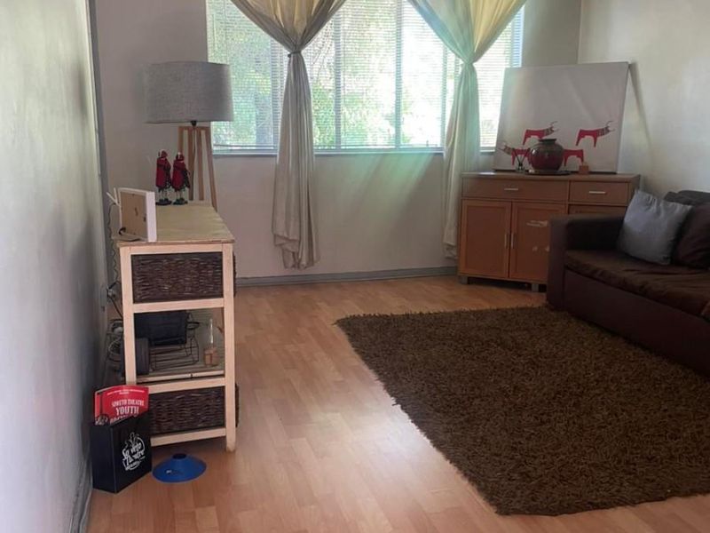 Relaxed living in a charming, secure complex with a communal braai and modern kitchen — two-bedroom, one-bath apartment with tiled lounge and dedicated garage parking.