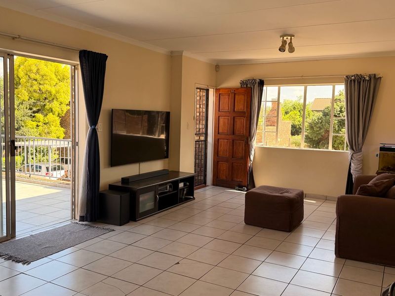 Live conveniently near Waterkloof High, Irene Village Mall and Rietvlei Nature Reserve — open-plan simplex with balcony, double garage and 5kW solar system for low-cost living.