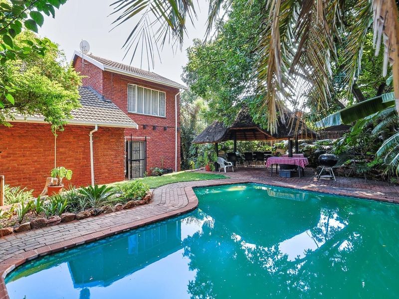 Entertainer's family retreat on Silverton Ridge, bordering Val de Grace in Pretoria East — expansive braai entertainment area, large established garden with pool and private under-tree jacuzzi; four beds.
