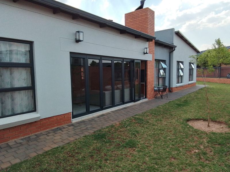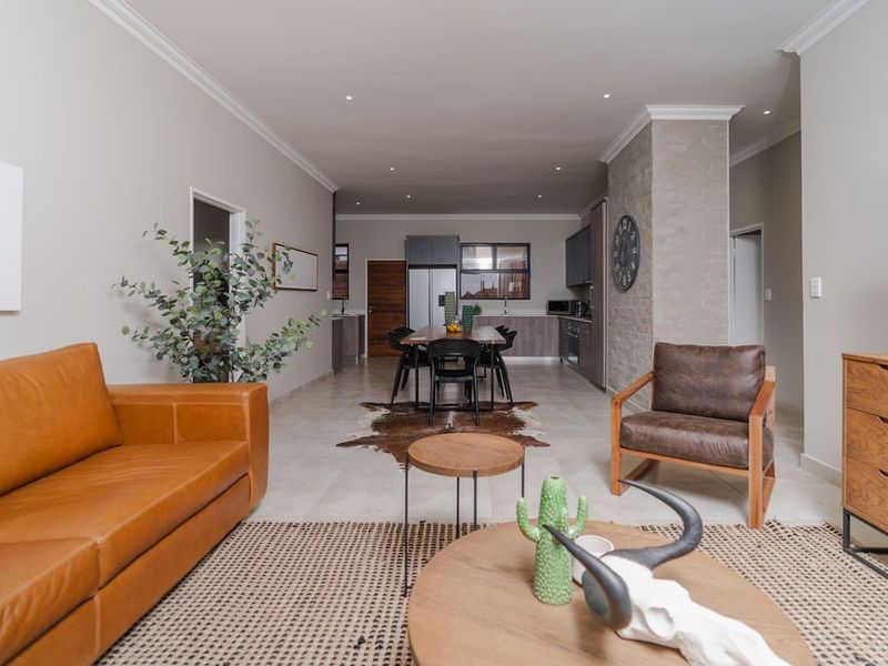 Relaxed lock-up-and-go living in Six Fountains Estate near Silver Lakes, with open-plan flow and a covered patio with built-in braai overlooking a private garden; three beds, two baths, double garage.