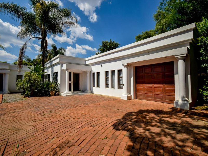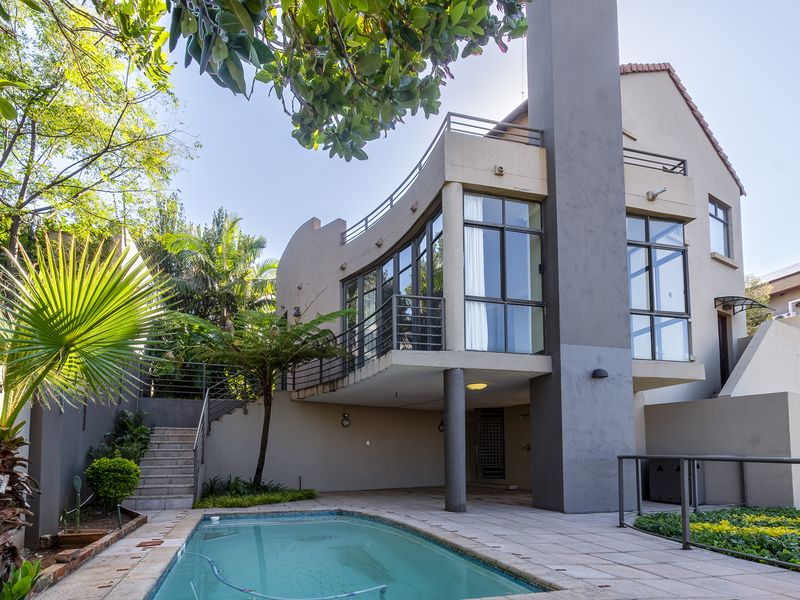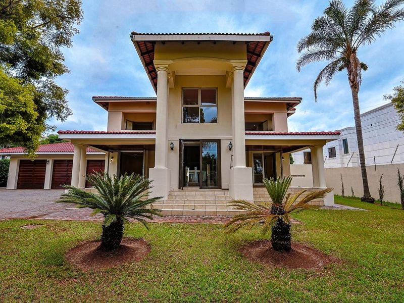 Entertainer's dream in Waterkloof Ridge, Pretoria — grand reception spaces flowing to a landscaped garden with rock pool and lapa; includes four bedrooms and four bathrooms.