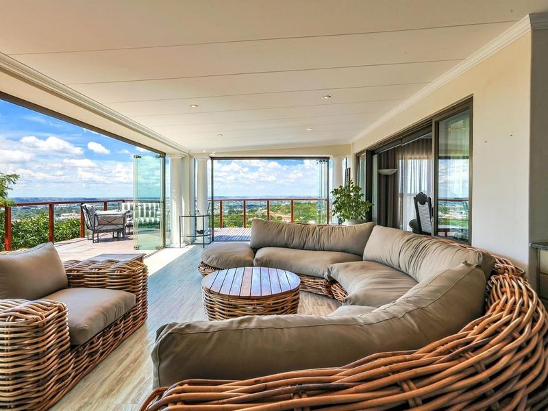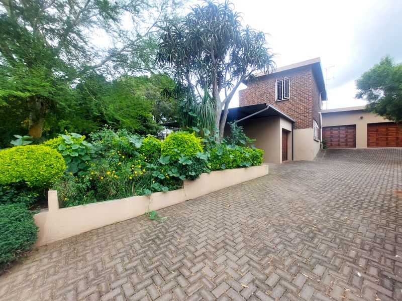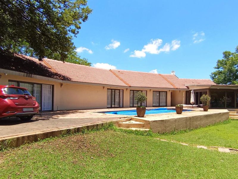 Relaxed family living in leafy Waterkloof Ridge with expansive grounds and panoramic views; features a separate guest suite with private entrance, borehole, and three-car garage.