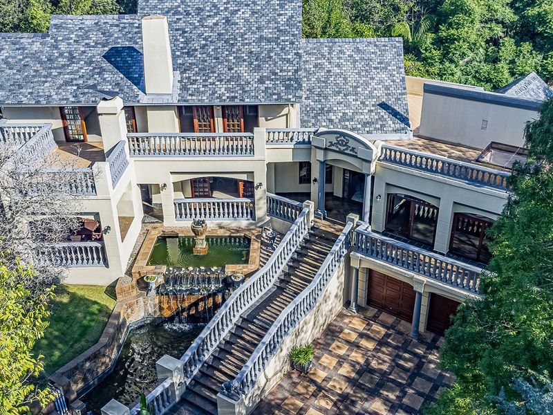 Elevated Waterkloof Ridge home with panoramic Pretoria views, embassy‑standard security, entertainer’s pavilion with pool and lapa, koi pond and gourmet kitchen — four bedrooms, triple garage.