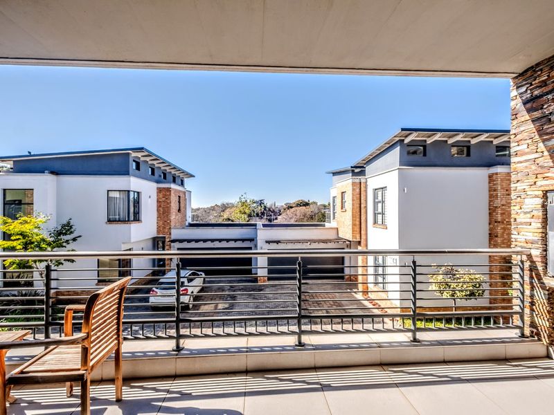 Entertainer's urban retreat in Waterkloof, close to The Village and Pretoria Country Club, with greenbelt views and covered balcony braai. Two bedrooms, two baths, garage.