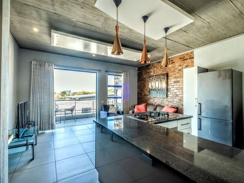 Unwind on a balcony with built-in braai and greenbelt views in a characterful, semi-industrial apartment on a quiet street near The Village and Pretoria Country Club, two beds, two baths.