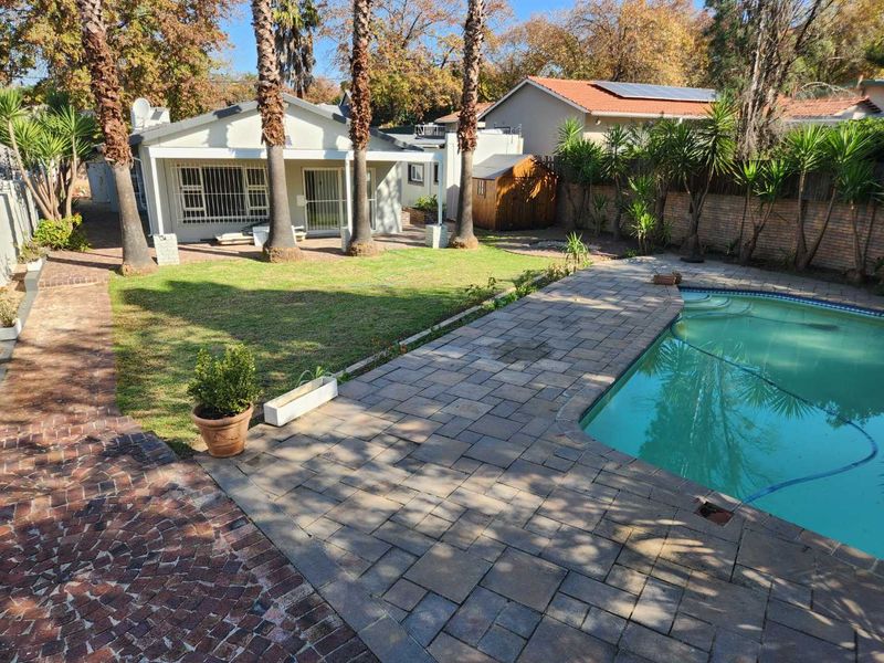 Relaxed living in leafy Blairgowrie, walking distance to Delta Park and schools, minutes to Hyde Park/Sandton — entertainer's patio with pool and fire pit; three beds, one bath, covered parking.