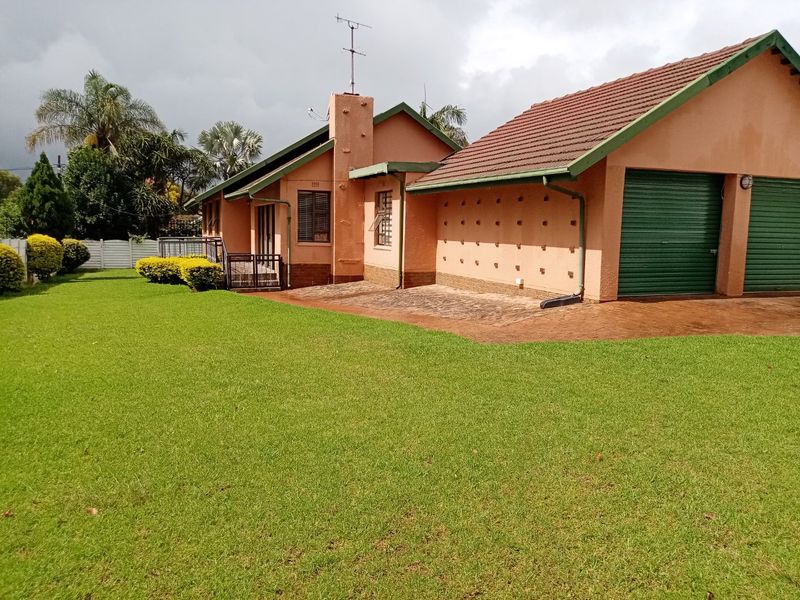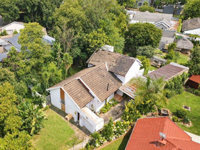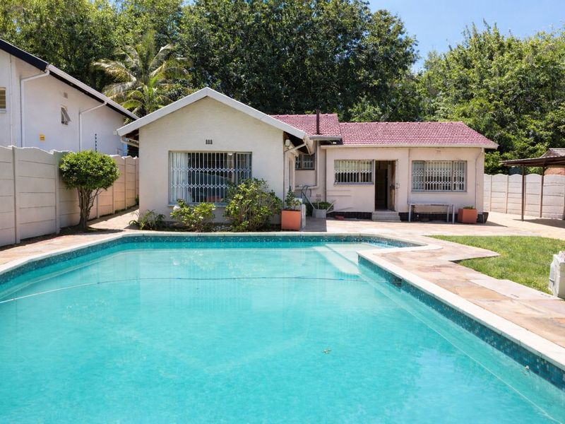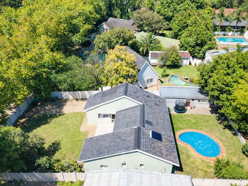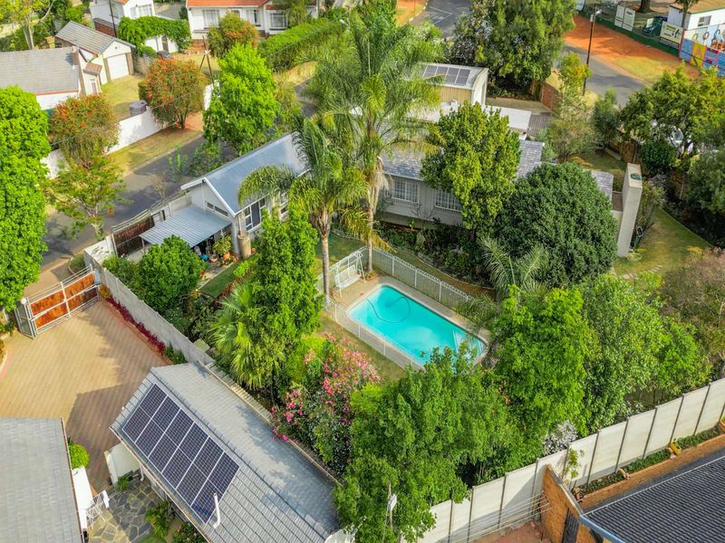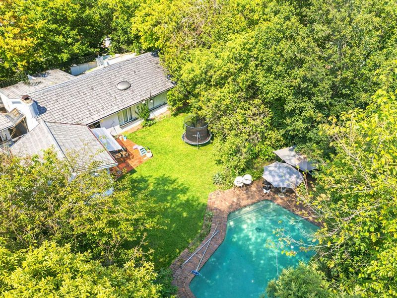 Entertainer's private oasis in a quiet, leafy neighborhood—H-shaped home wrapped by a huge 1,043m² garden, kidney-shaped pool and built-in braai; three bedrooms, two baths and single garage.