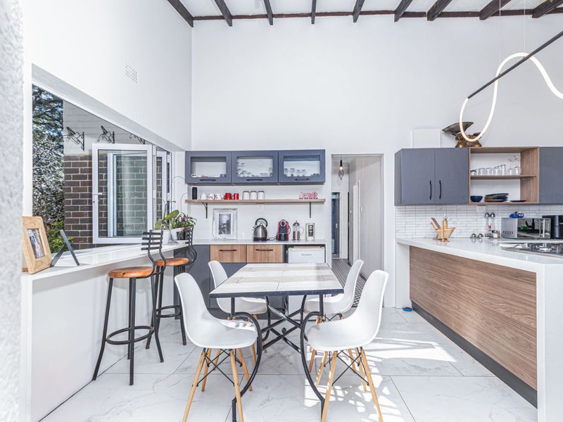 Summer-ready family entertainer in a leafy suburban pocket with seamless indoor-outdoor flow, pool and covered patio for braais. Three bedrooms, two bathrooms, plus staff quarters.