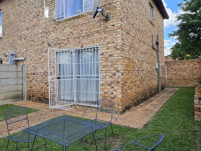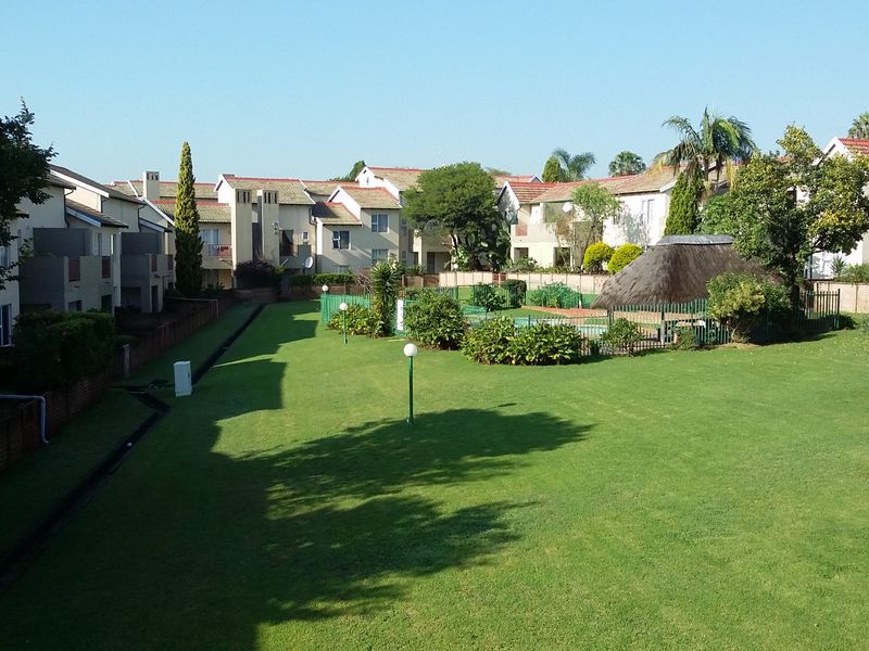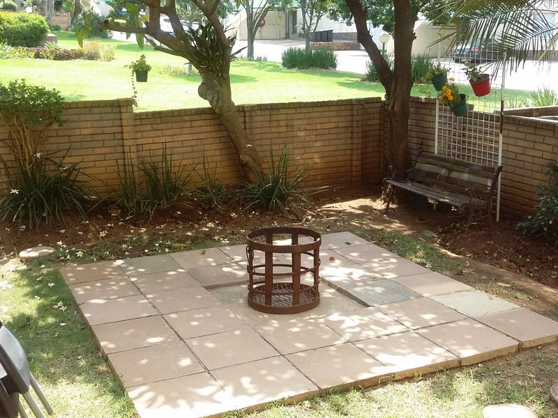 Relaxed ground-floor living in Caymans Complex, Bromhof (Randburg) with park-like communal gardens and pools — private garden and covered patio with built-in braai; two bedrooms, one bath.