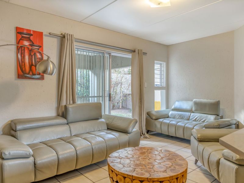 Effortless lock-up-and-go living in family-orientated Caymans Complex, Bromhof Randburg — sunlit open-plan spaces flowing to a private garden and covered patio. Two bedrooms, one bathroom.