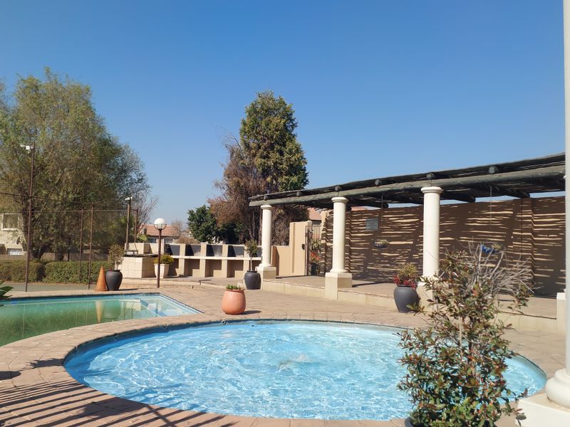 Resort-style living in a secure complex with pools and clubhouse; entertain on the covered patio with built-in braai—renovated 3-bed, 2-bath ground-floor apartment with two garages.