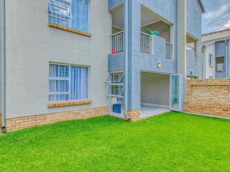 Resort-style Belmont Estate living with pools, parks and clubhouse — ground-floor corner apartment opening to a private garden and tiled patio with built-in braai; two beds, two baths and lock-up garage.