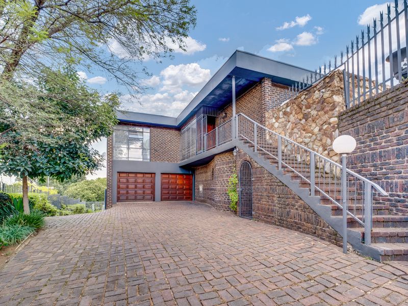 Elevated family living with panoramic vistas in Northcliff/Quellerina, backing onto a koppie with resident owls. Features rooftop lookout, indoor pool viewing window, five bedrooms, 4.5 bathrooms and four garages.