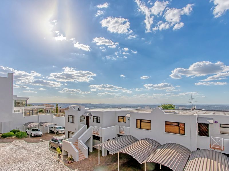 Enjoy lock-up-and-go Northcliff living with panoramic Johannesburg skyline views from Worlds View, open-plan living, close to shops and schools — two bedrooms, one bathroom, covered parking.