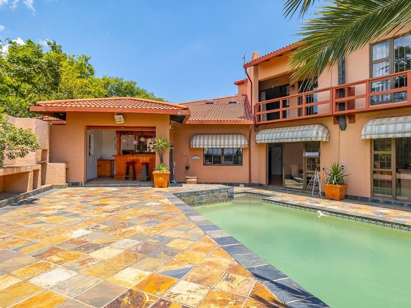 Elevated Northcliff lifestyle: entertainer’s oasis with sunlit lounge framed by French wooden windows, sparkling pool and red‑brick patio amid organic gardens — five bedrooms, three bathrooms, garage and extra parking.