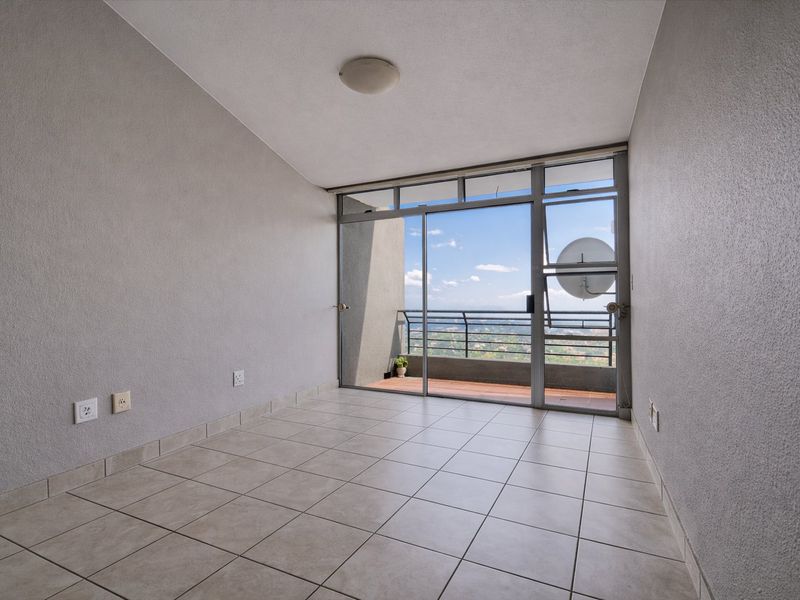 Relaxed urban living with sweeping 180° Johannesburg views, a private balcony for sundowners and communal pool entertaining — two bedrooms, two bathrooms and covered parking included.