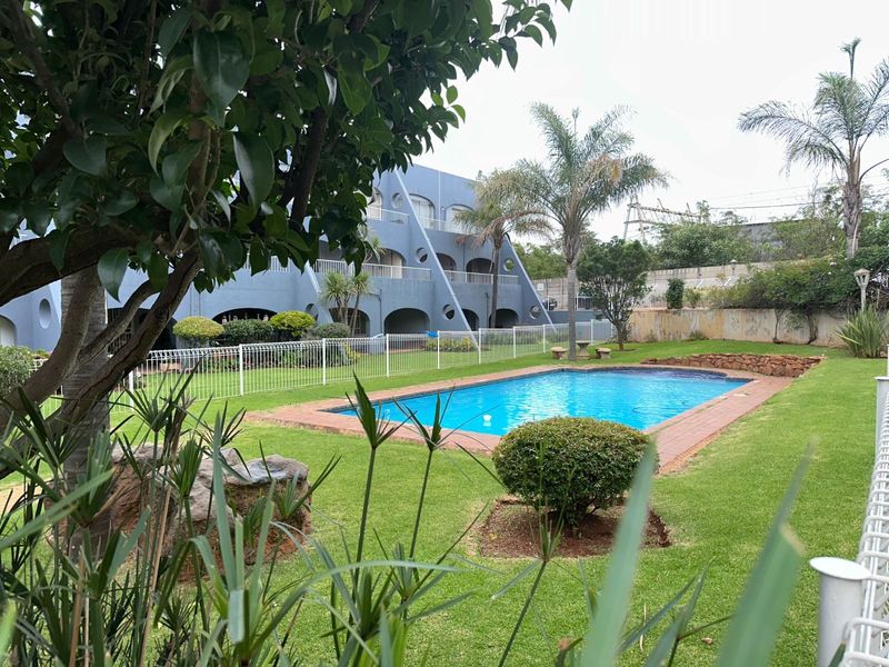 Effortless ground-floor living in the heart of Florida, Roodepoort, with a covered patio opening onto expansive communal gardens and pool; two bedrooms, one bathroom, single carport.