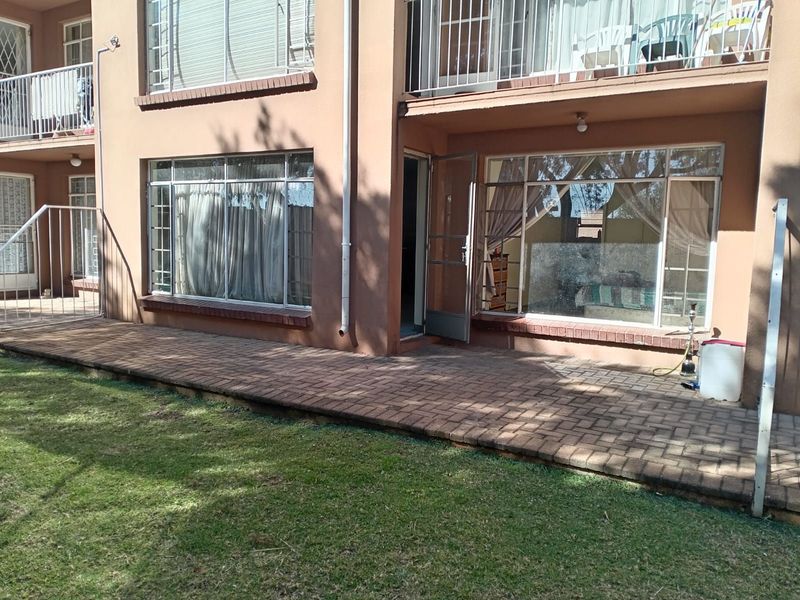 Resort-style community living in Flora Villas, Florida (Roodepoort), with private balcony, two pools and 24-hour security; two bedrooms, one bathroom and two parking spaces (one covered).