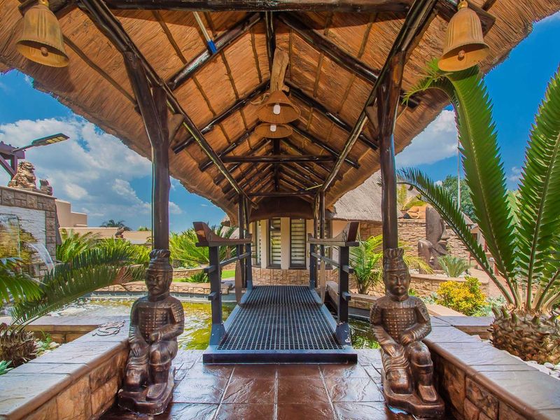 Entertainer's lifestyle in Helderkruin gated enclave with sweeping Magaliesberg views and seamless indoor-outdoor flow, featuring a koi pond, four bedrooms, three bathrooms, single garage.