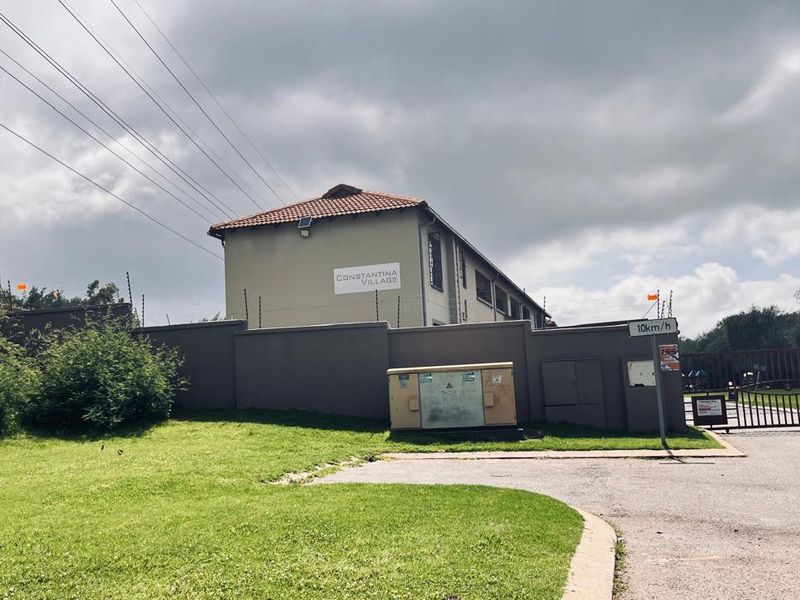 Family-friendly first-floor apartment in Constanina Village, Roodepoort West, set beside a small river with open play areas and jungle gym; open-plan kitchen, two bedrooms, one bathroom and carport.