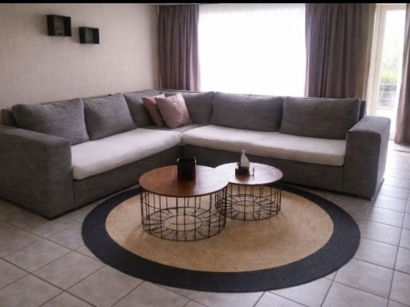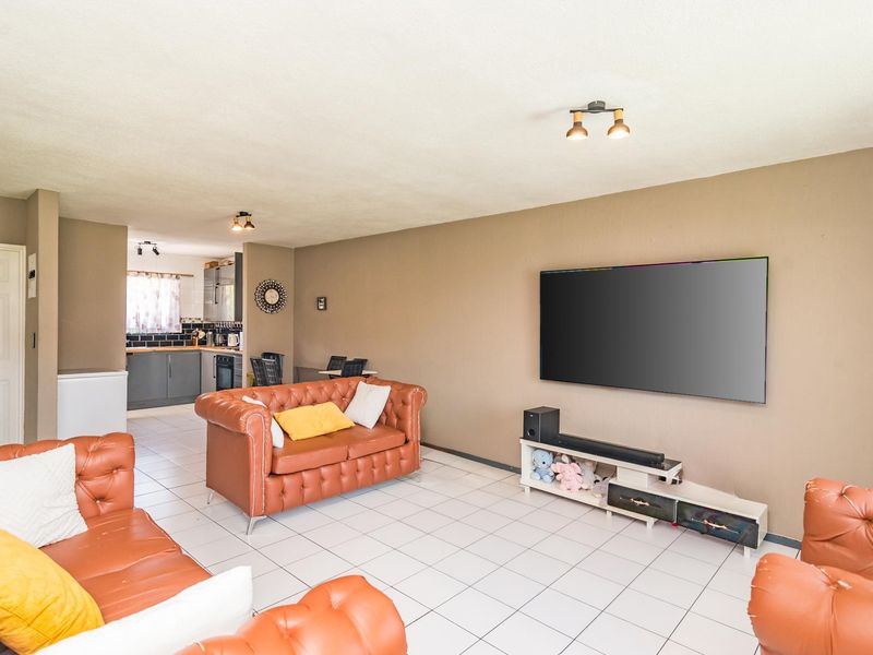 Family-focused living in a quiet, well-run complex close to shops and schools — seamless flow to a patio with built-in braai and established pet-friendly garden; three bedrooms, two baths, double garage.