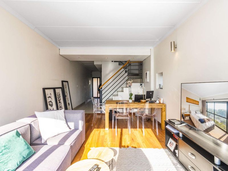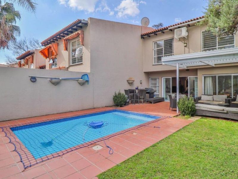 Rooftop entertaining minutes from Sandton City: modern triplex with large private roof balcony and city views, well-kept gardens, pool and 24-hour security. Two bedrooms, 2.5 baths, double garage.