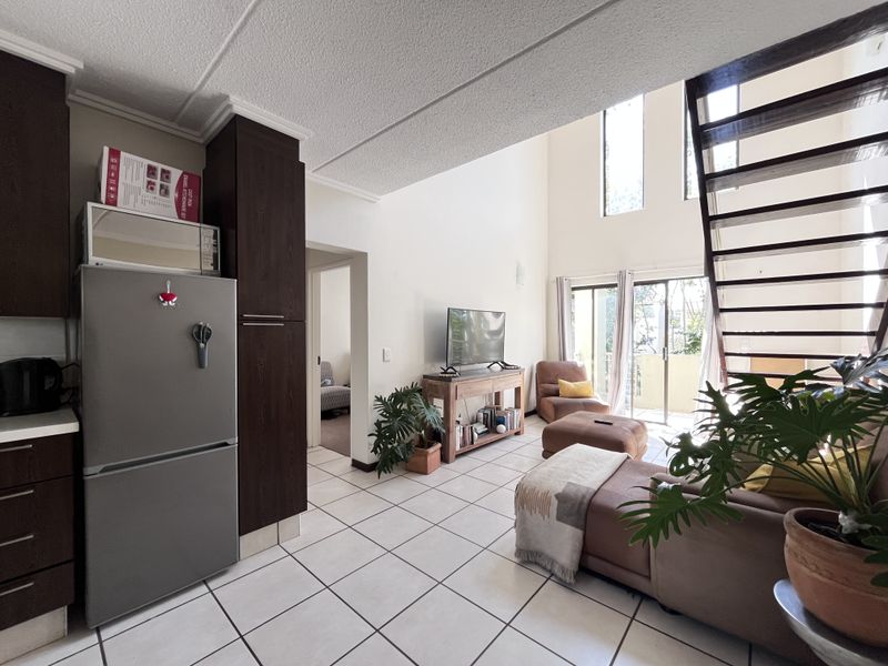 Effortless lock-and-leave living in Bryanston West — secure duplex with sunlit open-plan living flowing to a private garden and splash pool. Three bedrooms, 2.5 bathrooms, solar backup.