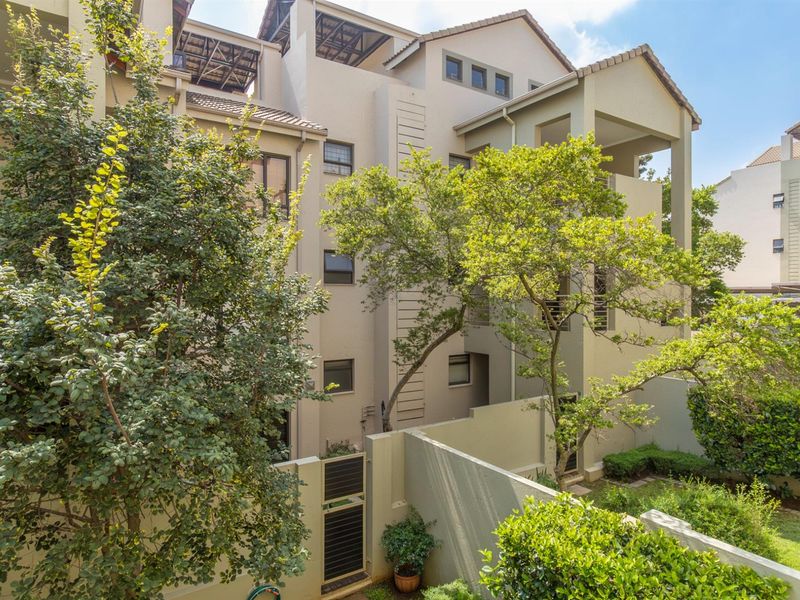 Effortless lock-and-leave living in Bryanston West — secure duplex with sunlit open-plan living flowing to a private garden and splash pool. Three bedrooms, 2.5 bathrooms, solar backup.
