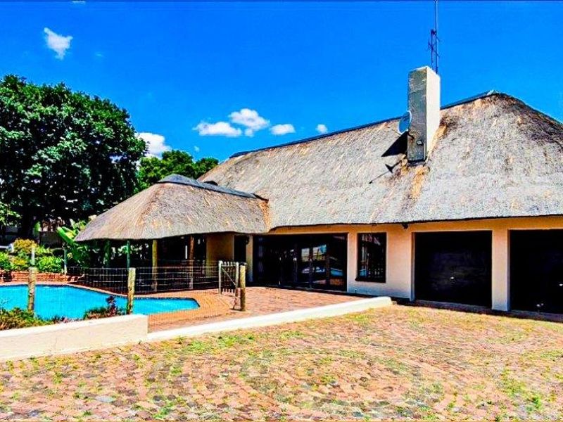 Entertainer's retreat set on expansive garden grounds, blending rustic thatch charm with poolside living and a massive lapa — flexible loft and cottage; four bedrooms, three bathrooms, double garage.