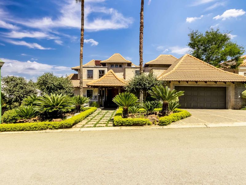 Resort-style golf living in Dainfern's prestigious estate, on a private north-facing stand with panoramic course views and covered pergola — five bedrooms, 5.5 baths, double garage.