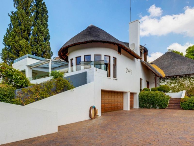 Character-filled thatched family home in central Dainfern Estate, steps from amenities — north-facing covered patio, established garden and pool, country kitchen with walk-in pantry; 3 beds, 2 baths, 3 garages.